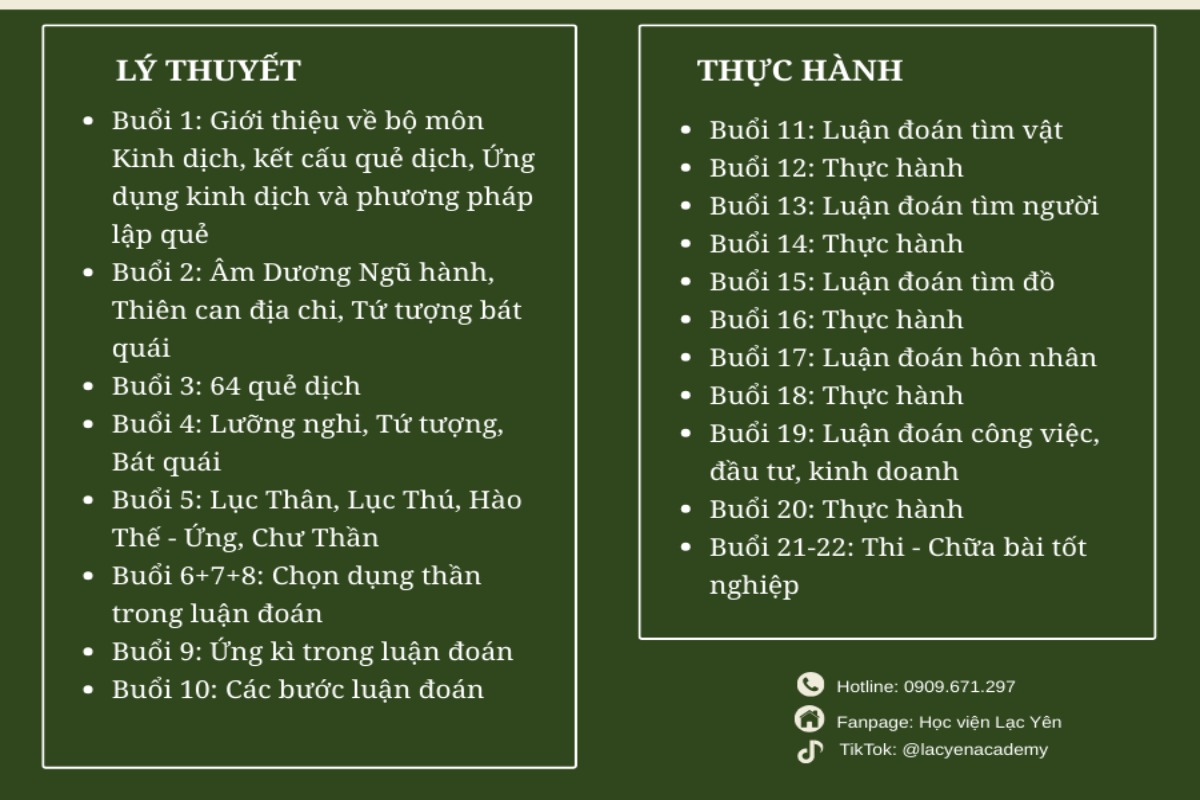 Nội dung khóa học được thiết kế khoa học, chia thành hai phần chính: Lý thuyết và Thực hành. Học viên sẽ bắt đầu từ những kiến thức cơ bản, mang tính nhập môn, làm quen dần với Kinh Dịch, sau đó từng bước tiếp cận các nội dung chuyên sâu và nâng cao hơn vào luận quẻ dịch theo từng chủ đề. Cách sắp xếp này giúp học viên dễ tiếp thu, hiểu đúng bản chất và biết cách ứng dụng kiến thức vào thực tế, tự tin hơn trong luận quẻ.