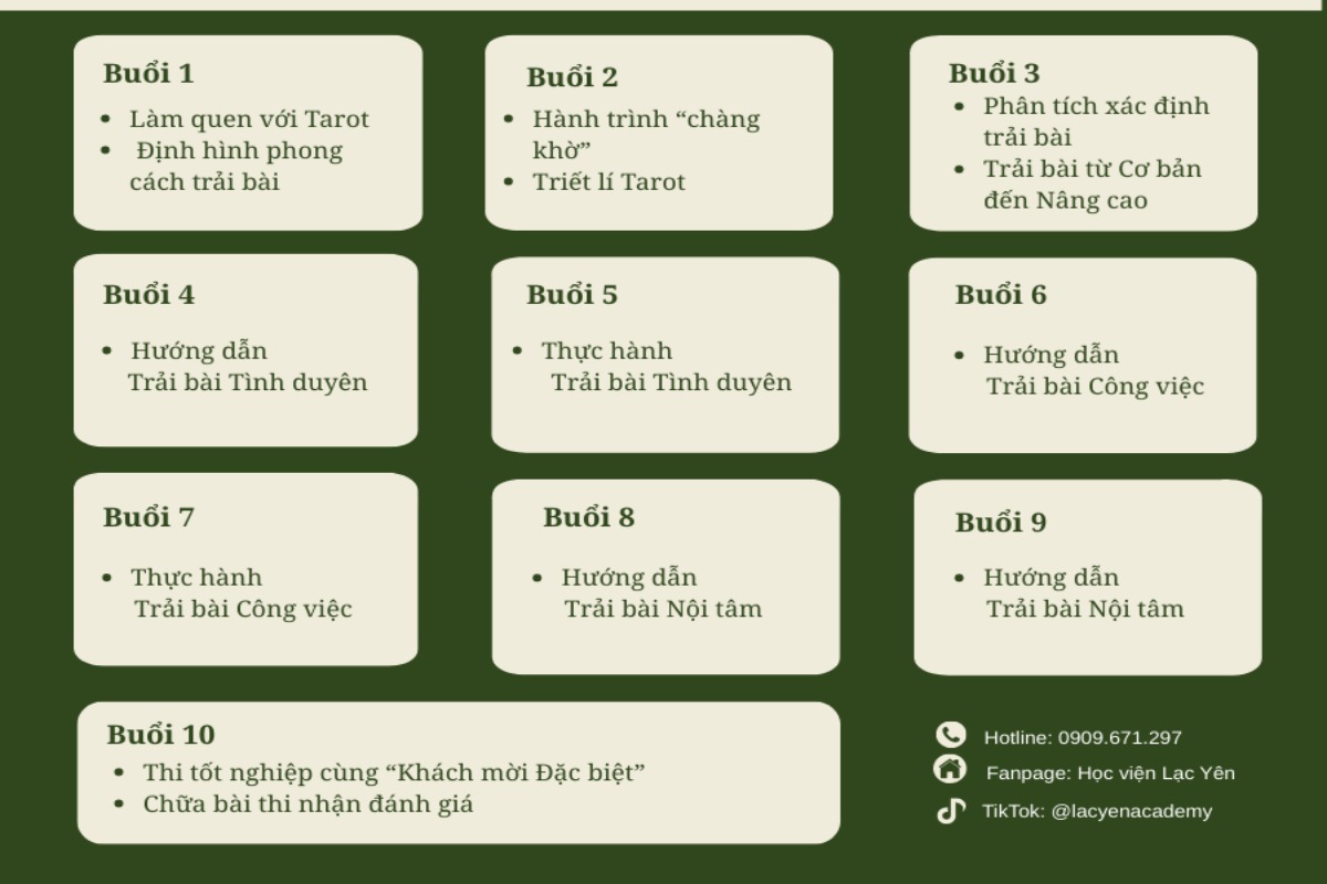 Nội dung khóa học được thiết kế khoa học, chia thành hai phần chính: Lý thuyết và Thực hành. Học viên sẽ bắt đầu từ những kiến thức cơ bản, mang tính nhập môn, làm quen dần với Tarot, sau đó từng bước tiếp cận các nội dung chuyên sâu và nâng cao hơn. Cách sắp xếp này giúp học viên dễ tiếp thu, hiểu đúng bản chất và biết cách ứng dụng kiến thức vào thực tế.